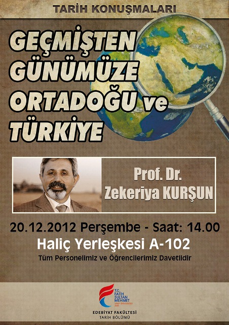 Üniversitemiz Edebiyat Fakültesi Tarih Bölümü tarafından düzenlenen Prof. Dr. Zekeriya Kurşun'un konuşmacı olarak katılacağı "Tarih Konuşmaları: Geçmişten Günümüze Orta Doğu ve Türkiye Semineri", 20 Aralık 2012 Perşembe günü saat: 14.00'de Haliç Yerleşkesi A-102 No'lu Salonda gerçekleştirilecektir.