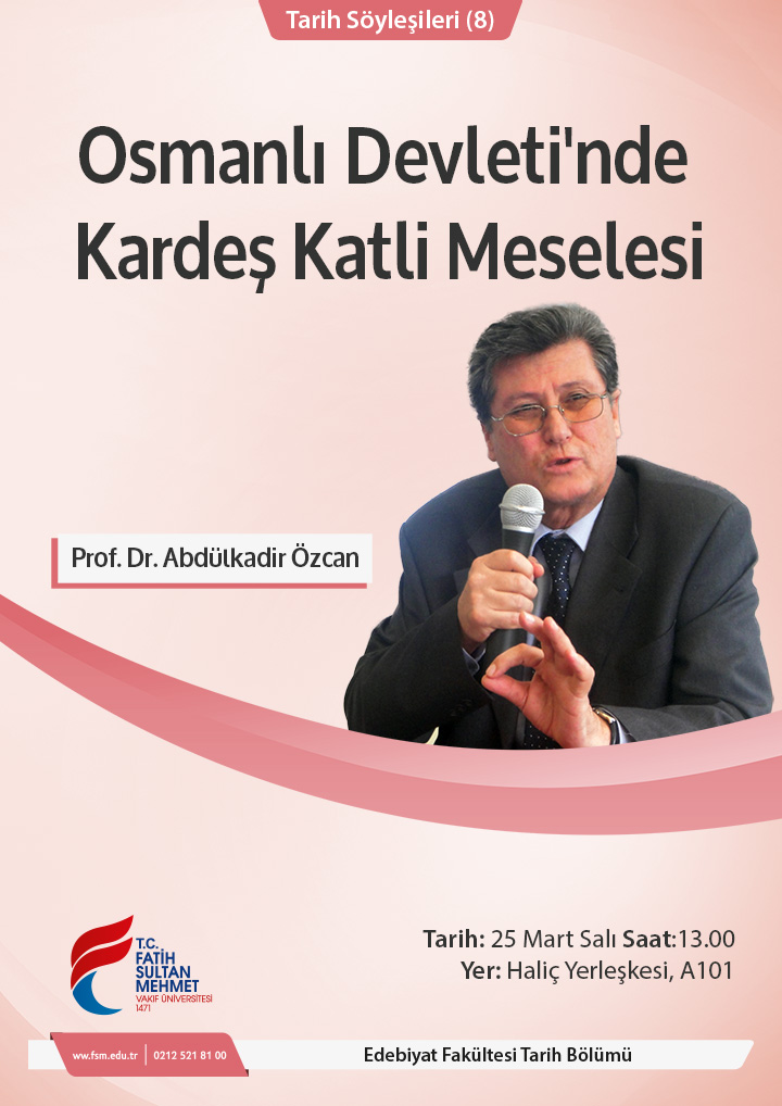 Üniversitemiz, Edebiyat Fakültesi Tarih Bölümü tarafından düzenlenecek olan ‘’Osmanlı Devletinde Kardeş Katli Meselesi’’ başlıklı Tarih Söyleşisi 25.03.2014 tarihinde saat 13:00’da Haliç Yerleşkesi A 101 nolu salonda gerçekleştirilecektir. Söyleşi, Öğretim Üyemiz Prof. Dr. Abdulkadir Özcan tarafından verilecektir.