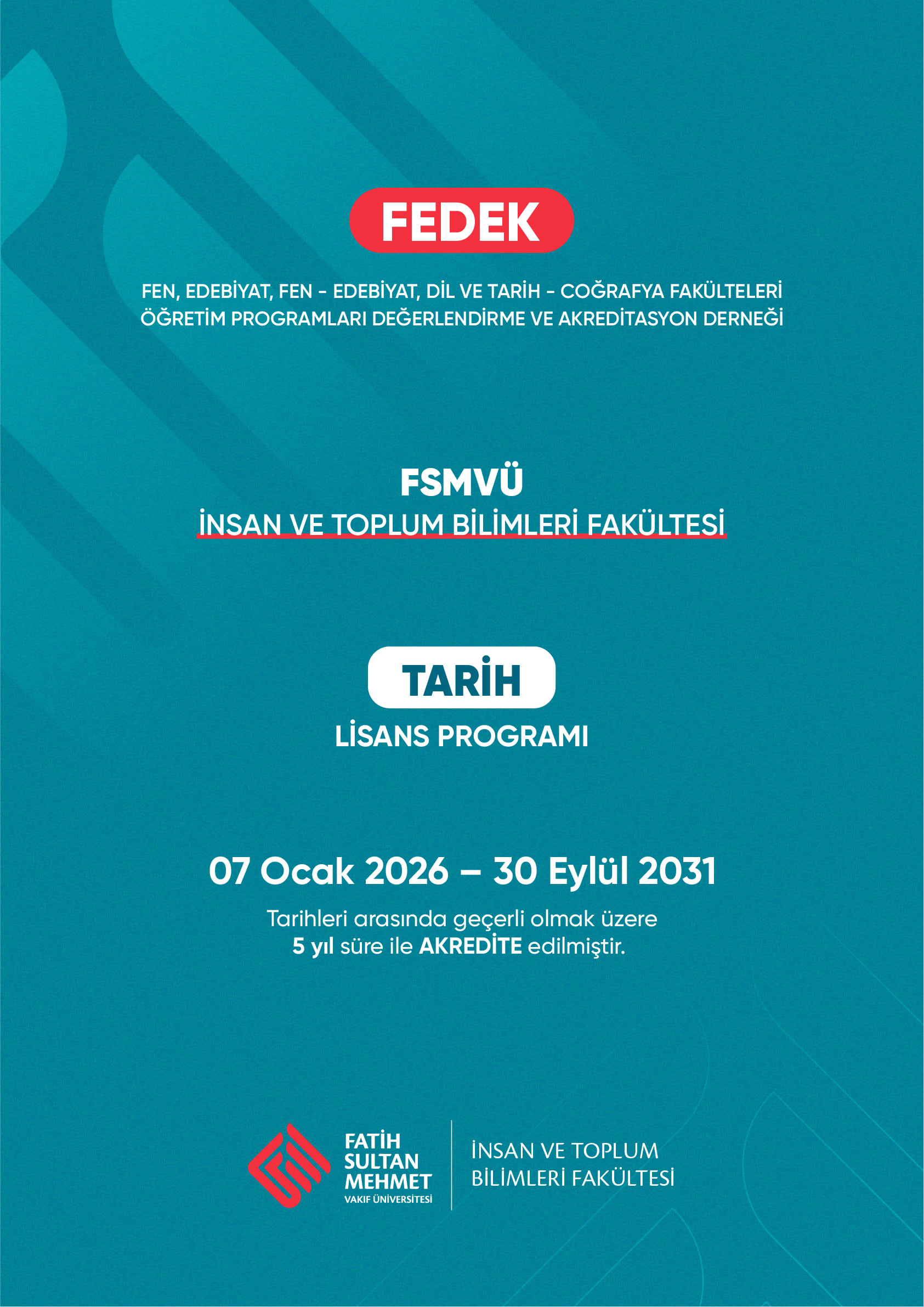 FEDEK Akreditasyon Derneğinin 09.01.2026 tarih ve 2026/033 sayılı yazısı ile İnsan ve Toplum Bilimleri Fakültesi’nin 2025 Değerlendirme Döneminde FEDEK tarafından İlk Kez Genel Değerlendirmeleri yapılan; Tarih Programına 5 (beş) yıllık AKREDİTASYON verilmiştir. Bu süreçte emeği geçen Bölüm Başkanımıza ve Akreditasyon Sorumlularımıza teşekkür ederiz.