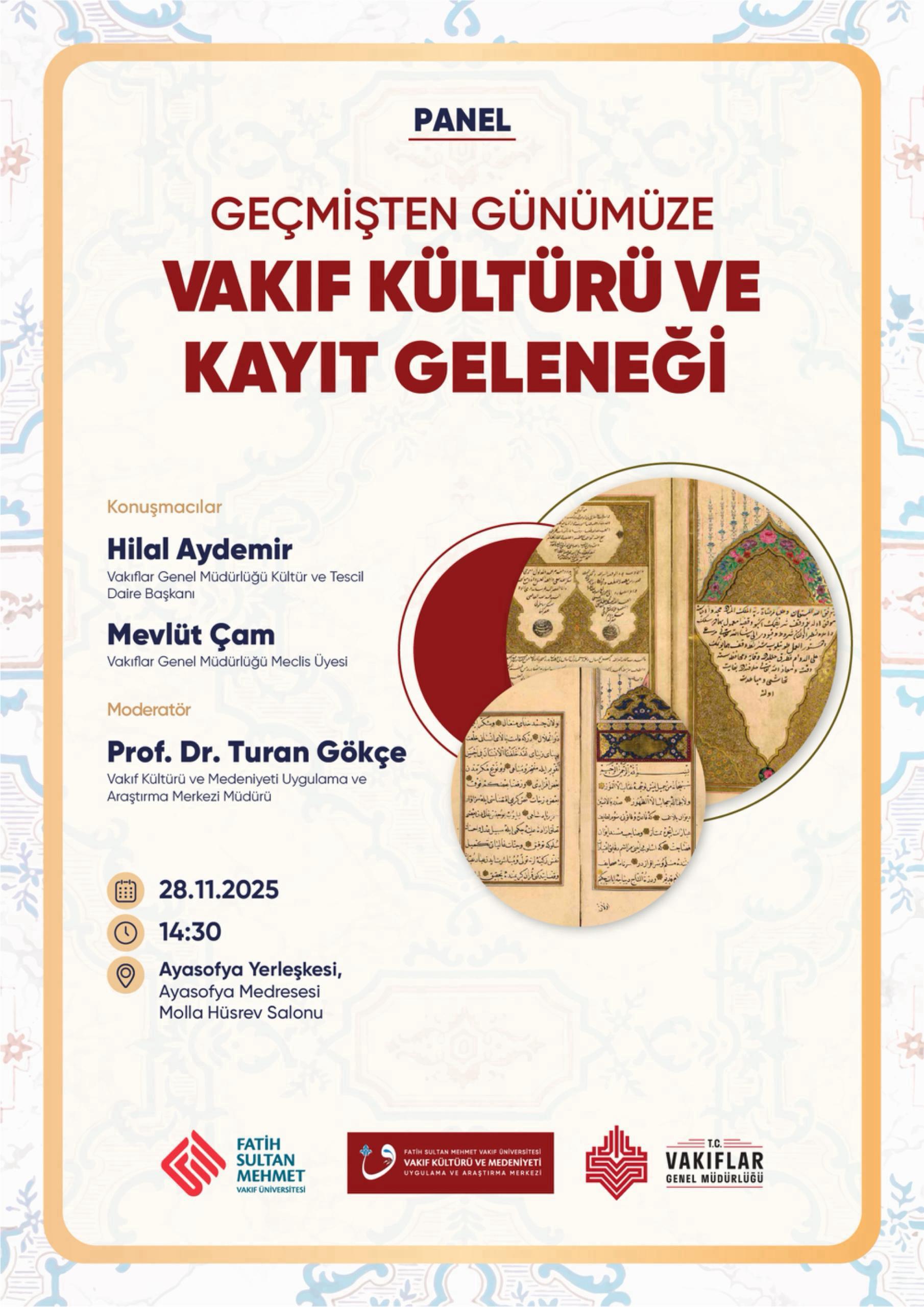 Vakıf Kültürü ve Medeniyeti Araştırma Merkezi'nin düzenlediği "Geçmişten Günümüze Vakıf Kültürü ve Kayıt Geleneği" başlıklı panel Hilal Aydemir ve Mevlüt Çam'ın katılımlarıyla ve Prof. Dr. Turan Gökçe Hocamızın moderatörlüğünde 28 Kasım 2025 tarihinde Ayasofya Yerleşkesi Molla Hüsrev Salonunda gerçekleştirilecektir.